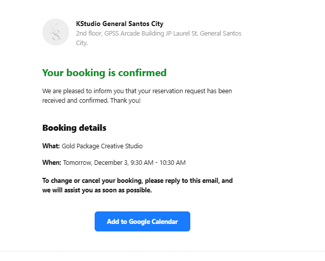 Could you please check your inbox (hello@kstudio.media) and let me know if you see a notification about my booking?