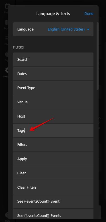 Finally, open the Edit Texts section on the Settings tab and change the Tags to Country ![]()