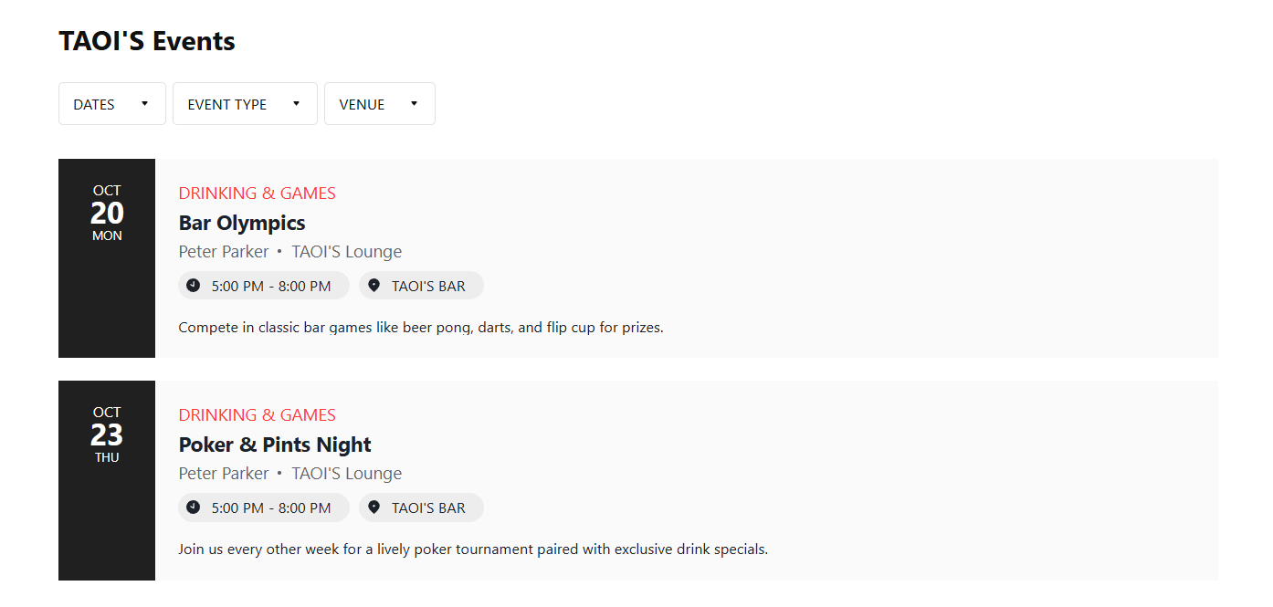 Example: An owner of a Bar wants to get more business coming in so they think of hosting events at their location but theyâre super busy to be creative so they use Elfsightâs AI Event Calendar Generator and they write: âI am a owner of a bar where people drink & eat generate me 2 events I can do that is related or creates traction to my business. My Address: *1234 St NY* Host: Peter Parker, Colors Grey & Red, Business Name: TAOIâS BAR. Time: 5pm to 8pmâ. *Result Below*